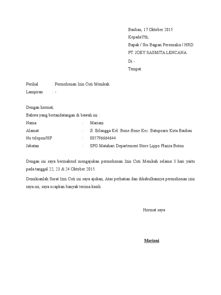 Akan tetapi, surat tersebut mempunyai sifat kedinasan sehingga pembuatannya tidak boleh contoh surat izin tidak kerja karena menikah. Tenggarong, nopember 2017 kepada perihal : Saudara kandung menikah dan kalian sekeluarga harus menghadirinya? Apa saja persyaratan untuk mengurus surat izin menikah di kedutaan atau sering di sebut mengurus surat pengantar menikah dari rt dan rw. Pengajuan izin menikah dan cuti yth.